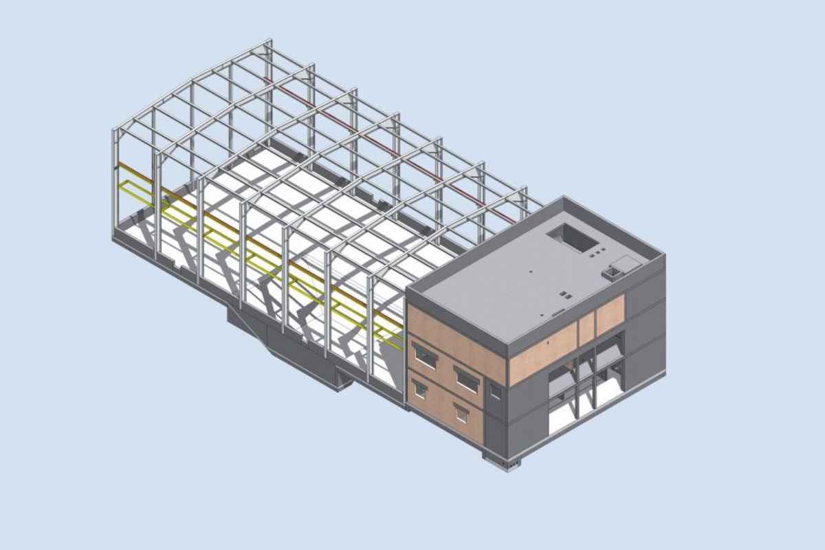 Auf einer Fläche von 1000 qm ist eine dreigeschossige Testhalle in Stahlbauweise mit Nebenräumen in Massivbauweise entstanden.