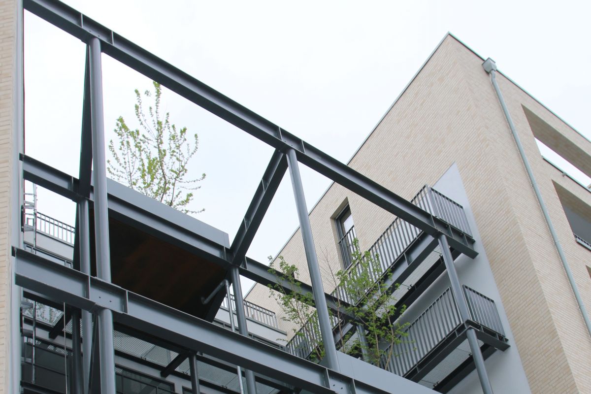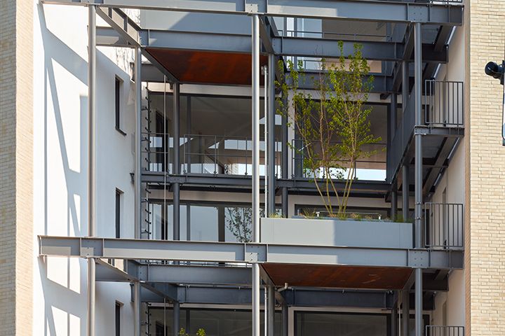 Die Wohntürme treten als eigenständige Häuser in Erscheinung, dazwischen werden großzügige Dachgärten ausgebildet. Diese begrünten Gebäudefugen bestehen aus gespannten, filigranen Stahlkonstruktionen mit eingehängten, schwebenden Pflanztrögen, in den Bäume wachsen.