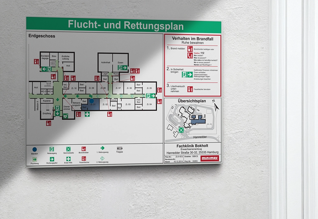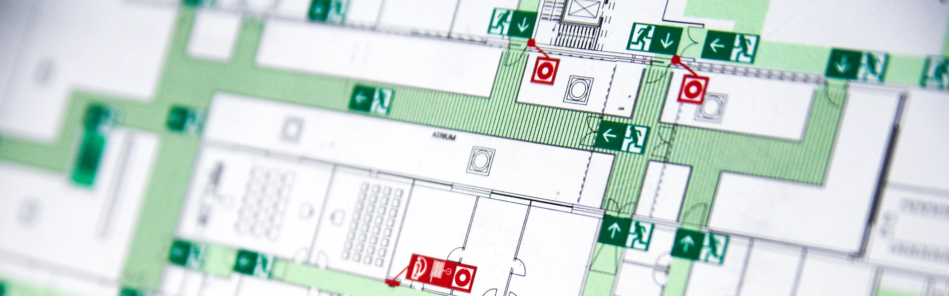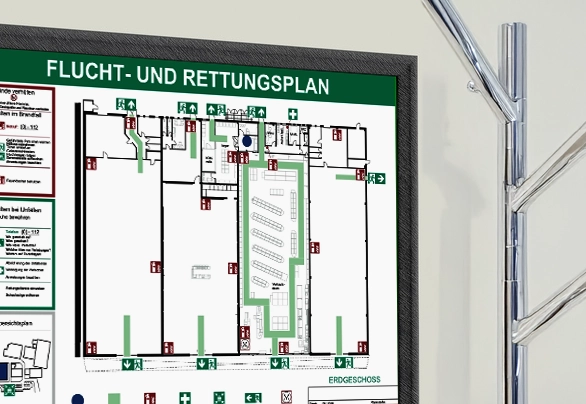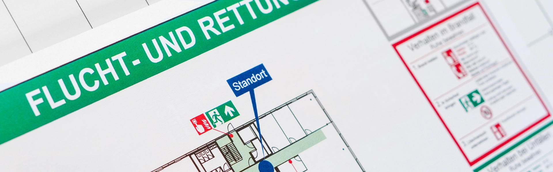 - Einzeichnen von: Fluchtwegen, Notausgängen, Brandmeldern, Feuerlöschern, Erste-Hilfe-Einrichtungen, Standort, Sammelstellen